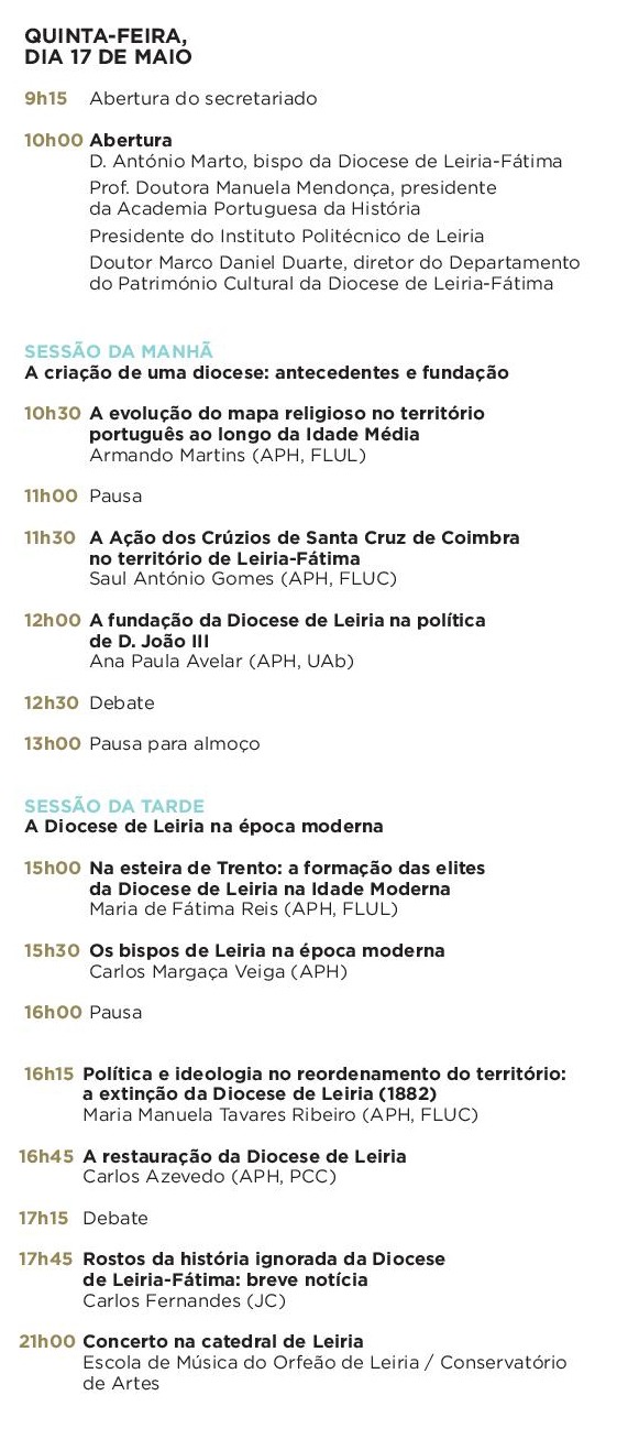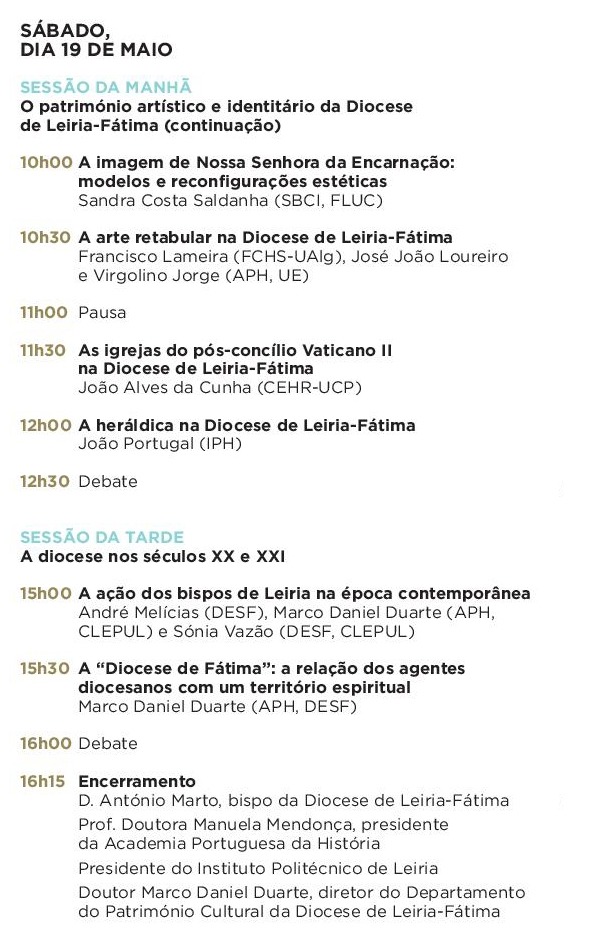No segundo dia, D. Manuel Clemente, bispo de Lisboa e historiador, fala sobre “a diocese extinta até ter o estatuto de diocese central na vida ecleciástica do país, sobretudo pela questão de Fátima. É uma centralidade não apenas no país, mas mundial”, nota Marco Daniel Duarte. Sexta-feira, dia 18, será também importante para perceber o património artístico da Diocese, “uma área que nos escapa quando andamos pelas ruas”, diz o diretor do Departamento do Património Cultural, lembrando a Sé Catedral, o Santuário dos Milagres ou a imagem da Senhora da Encarnação.