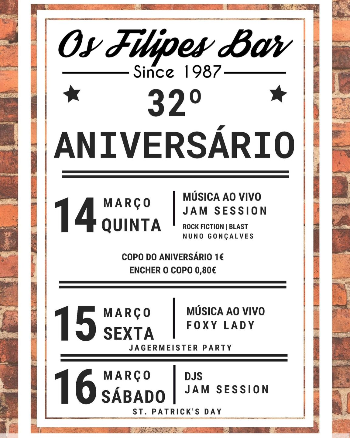 Esta quinta, dia 14, Os Filipes Bar celebra 32 anos com show ao vivo das bandas Blast e Rock Fiction, acompanhadas do tradicional copo de aniversário. Sexta, 15, a atração é a Foxy Lady e no sábado, 16, há jam session com diferentes djs para celebar o St. Patrick’s Day.