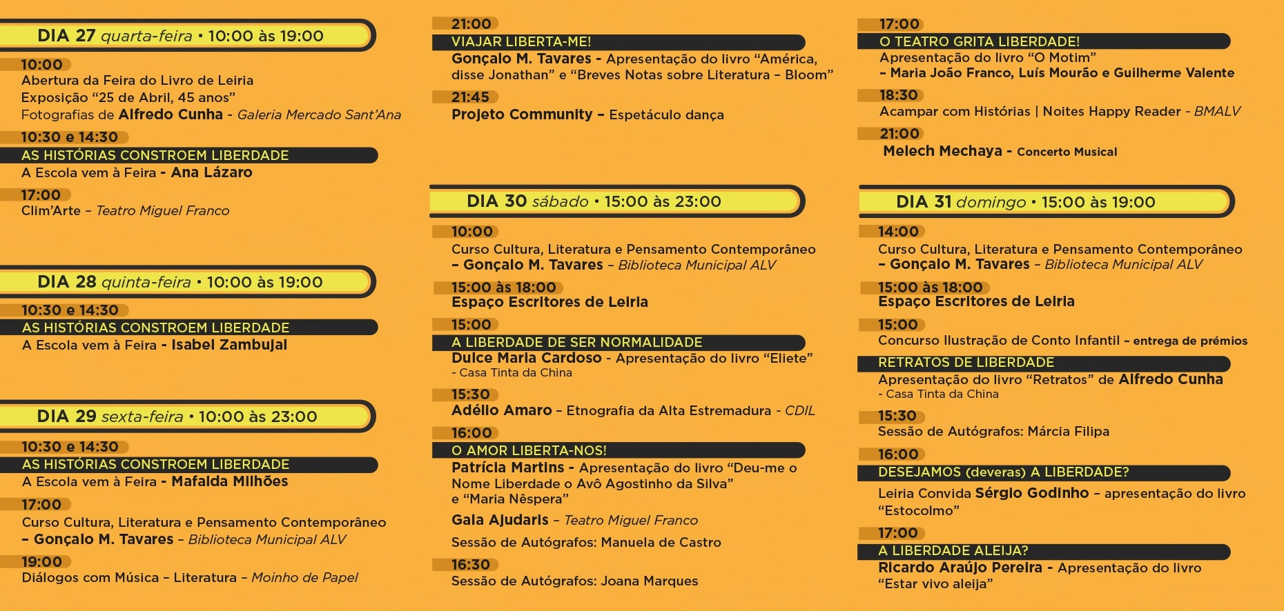 Há vários destaques entre os autores convidados:. Ricardo Araújo Pereira apresenta o mais recente “Estar vivo aleija” no dia 31 de março, às 17 horas. Nesse mesmo dia, às 16 horas, Sérgio Godinho fala do livro “Estocolmo” e, antes, o fotógrafo Alfredo Cunha conversa a propósito do livro “Retratos”, ele que tem uma exposição patente na galeria do Mercado Santana.
