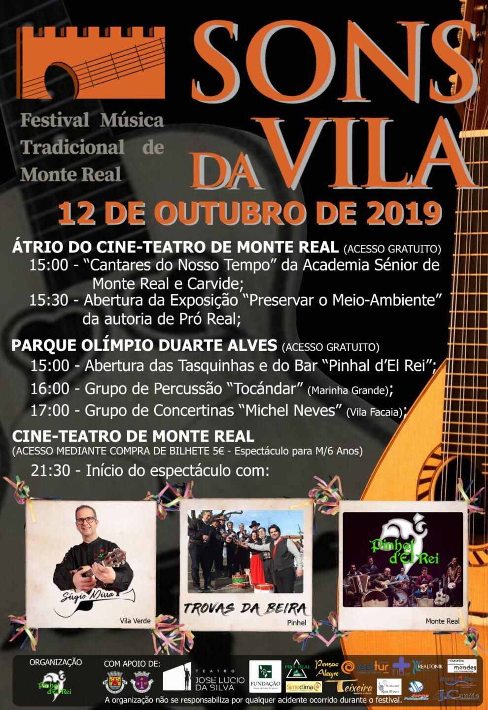O festival Sons da Vila começa às 15 horas, com a abertura as tasquinhas e bar no Parque Olímpio Duarte Alves e atuação da Academia Sénior de Monte Real e Carvide no átrio do Cine-Teatro. De volta ao parque, às 16 horas atua o grupo de percussão Tocándar, seguindo-se a atuação do grupo de concertinas Michel Neves, de Vila Facaia. À noite, no Cine-Teatro, há espetáculo a partir das 21h30 com Sérgio Mira, de Vila Verde, Trovas da Beira, de Pinhel, e o anfitrião Pinhal d’El Rei. A entrada no programa da tarde é gratuita, no espetáculo à noite custa 5 euros