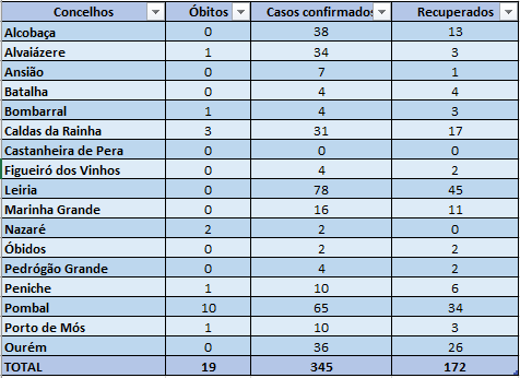 Quanto ao número de óbitos, foram registados 19 na região desde o passado dia 17 de março, tendo dez ocorrido no concelho de Pombal.