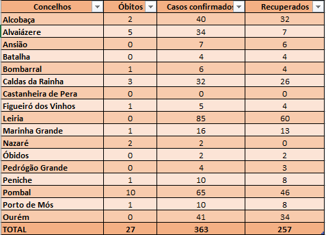 A situação epidemiológica relativa aos 16 municípios do distrito de Leiria e concelho de Ourém mantém-se assim em 27 óbitos, 363 casos confirmados e 257 recuperações.