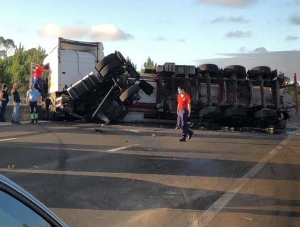 Segundo o Centro Distrital de Operações e Socorro de Leiria, o veículo, que transportava cimento em pó a granel, está atravessado nas três faixas de rodagem, pelo que não é possível circular naquele sentido.