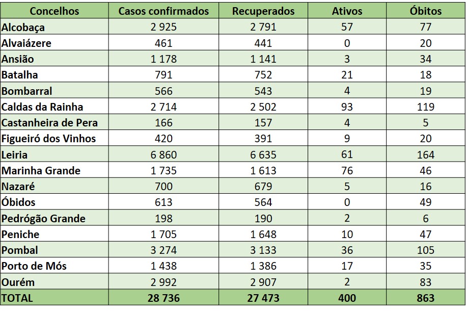 Os restantes concelhos onde há registo de novas infeções são Leiria (5), Alcobaça (3), Pombal (2) e Caldas da Rainha (1).