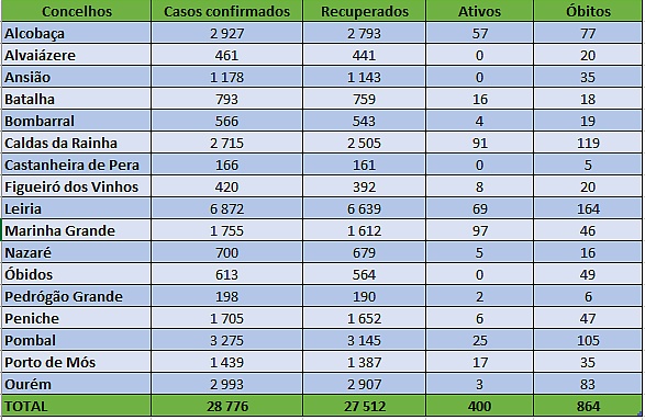 Nas últimas 24 horas, foram detetados novos casos na Marinha Grande (7), Leiria (5) e Alcobaça (1). No que refere a recuperações, elas foram registadas em maior número na Batalha (5) e em Castanheira de Pera (4).