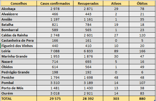 Os dados de hoje elevam para 29.575 o total de casos confirmados desde o início da pandemia no distrito de Leiria e concelho de Ourém, e para 28.350 as recuperações.