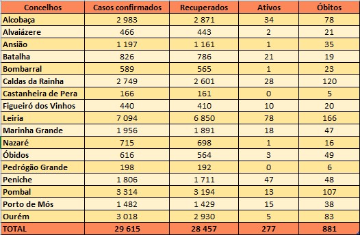 Desde o início da pandemia, o distrito de Leiria e concelho de Ourém contabilizaram um total de 29.615 casos de infeção pelo SARS-CoV-2, tendo 28.457 já recuperado.