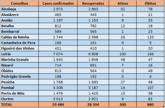 Desde o início da pandemia, a região (distrito de Leiria e concelho de Ourém) acumulou 29.484 testes positivos de Covid-19, e 28.304 recuperações, 18 das quais nas últimas 24 horas.