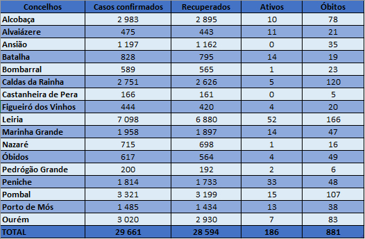 Desde o início da pandemia, o distrito de Leiria e concelho de Ourém contabilizaram um total de 29.6661 casos de infeção pelo SARS-CoV-2, tendo 28.594 já recuperado.