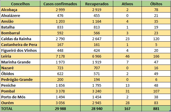 Os dados divulgados pelo REGIÃO DE LEIRIA incluem sempre o concelho de Ourém. Apesar de pertencer ao distrito de Santarém, mantém com Leiria grande proximidade e tem o Hospital de Santo André como hospital de referência.
