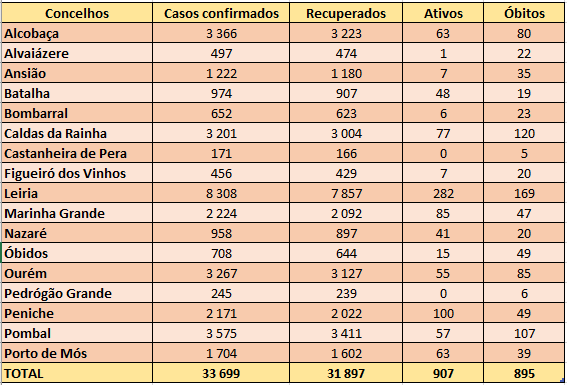Desde o início da pandemia, em março de 2020, o distrito de Leiria e concelho de Ourém somaram 33.699 casos de infeção por SARS-CoV-2 e registaram 895 óbitos associados à doença. Recuperaram entretanto 31.897 pessoas.