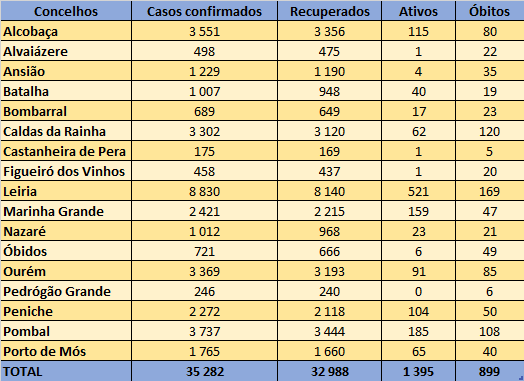 Desde o início da pandemia, em março de 2020, a região de Leiria registou 35.282 casos confirmados e 32.988 recuperações. Há ainda a lamentar 899 mortes.