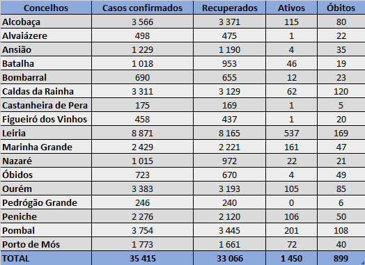 Desde o início da pandemia, em março de 2020, a região de Leiria registou 35.415 casos confirmados e 33.066 recuperações. Há ainda a lamentar 899 mortes.