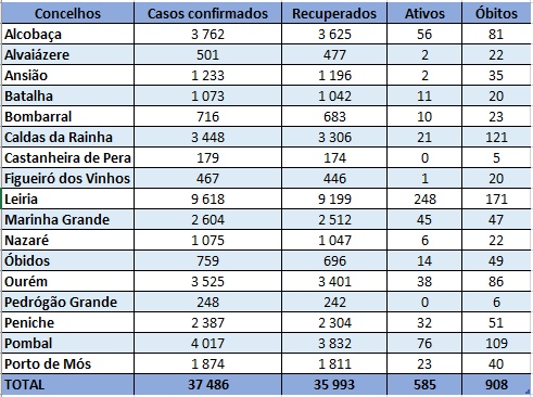 Os dados divulgados pelo REGIÃO DE LEIRIA referem-se aos 16 concelhos do distrito de Leiria e ao concelho de Ourém que, apesar de pertencer ao distrito de Santarém, mantém com Leiria grande proximidade e tem o Hospital de Santo André como hospital de referência.