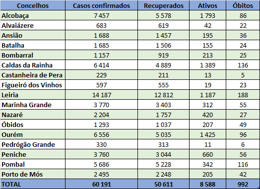 A maioria dos novos casos confirmados (882) diz respeito aos concelhos de Alcobaça, com 186, Caldas da Rainha, com 171, Ourém, com 137, e Peniche, com 128.