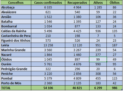 O balanço divulgado na madrugada deste domingo pela Comissão Distrital de Proteção Civil de Leiria e municípios não inclui os dados relativos aos municípios integrados nos agrupamentos de centros de saúde Pinhal Litoral e Pinhal Interior Norte (que atualiza os dados apenas duas vezes por semana). Também não consta deste balanço a atualização da situação epidemiológica em Óbidos.