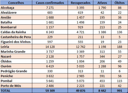 Os dados divulgados pelo REGIÃO DE LEIRIA referem-se aos 16 concelhos do distrito de Leiria e ao concelho de Ourém que, apesar de pertencer ao distrito de Santarém, mantém com Leiria grande proximidade e tem o Hospital de Santo André como hospital de referência.