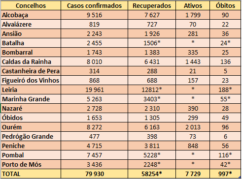 Fonte: Comissão Distrital de Proteção Civil de Leiria, Unidade de Saúde Pública do Médio Tejo e municípios. Dados acumulados desde o início da pandemia em março de 2020