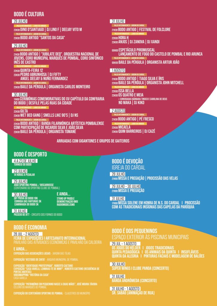 Antes dos cabeças de cartaz, atuam artistas na sua maioria naturais do concelho. O presidente da Câmara de Pombal afirmou, na apresentação desta edição do Bodo que, “para além de ser um cartaz intergeracional, é uma montra dos artistas locais e isso este ano é uma evidência, em que mais de dois terços dos grupos e djs que vão atuar são artistas locais”.