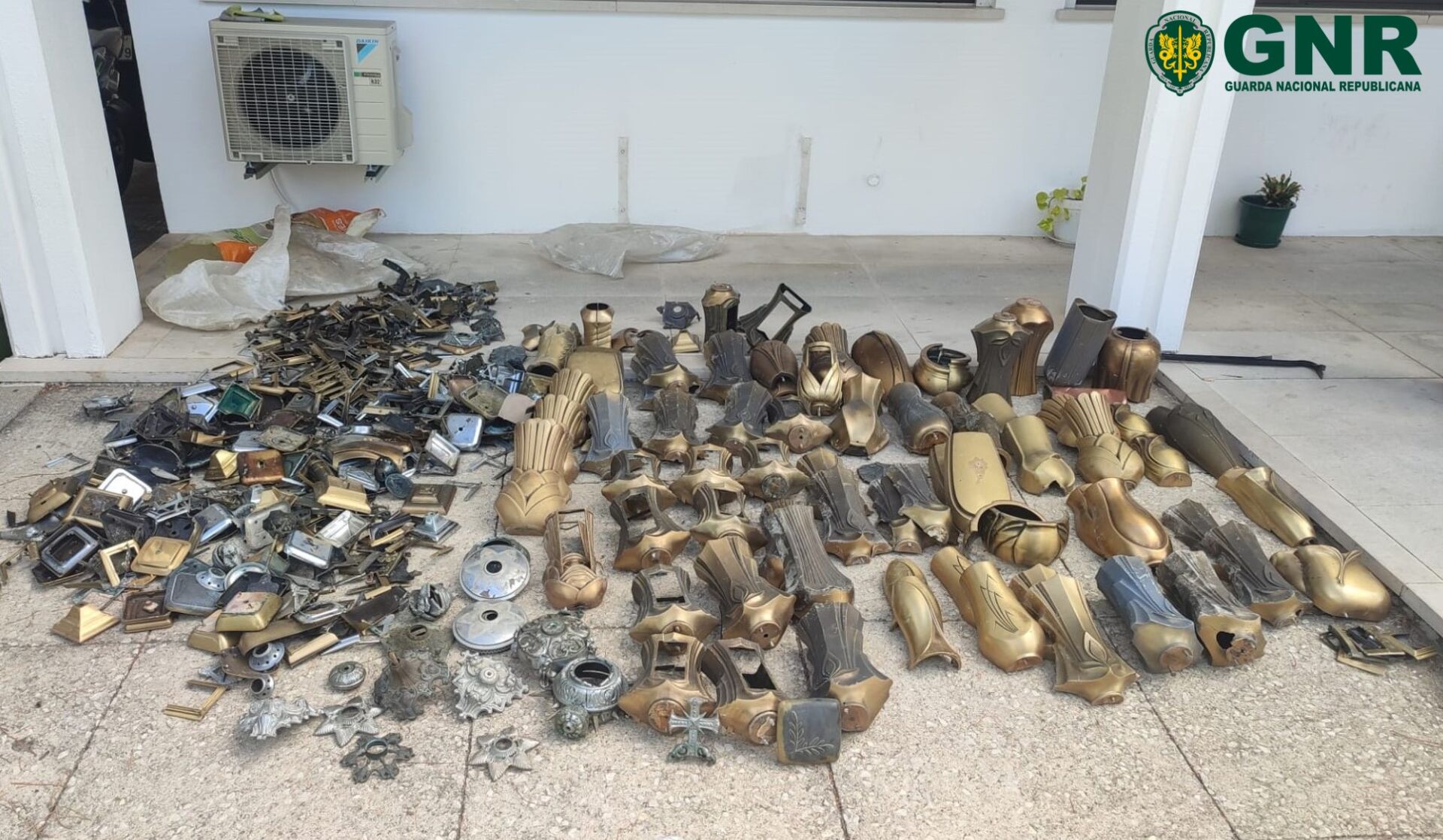 No total, foram apreendidos 40 jarras de arte sacra; 14 candeeiros de arte sacra; diversas peças de arte sacra, num total de 100 quilos; ferramentas de corte; três telemóveis; uma viatura; 80 euros em numerário; e diversos documentos relacionados com o furto e venda de artigos de arte sacra.