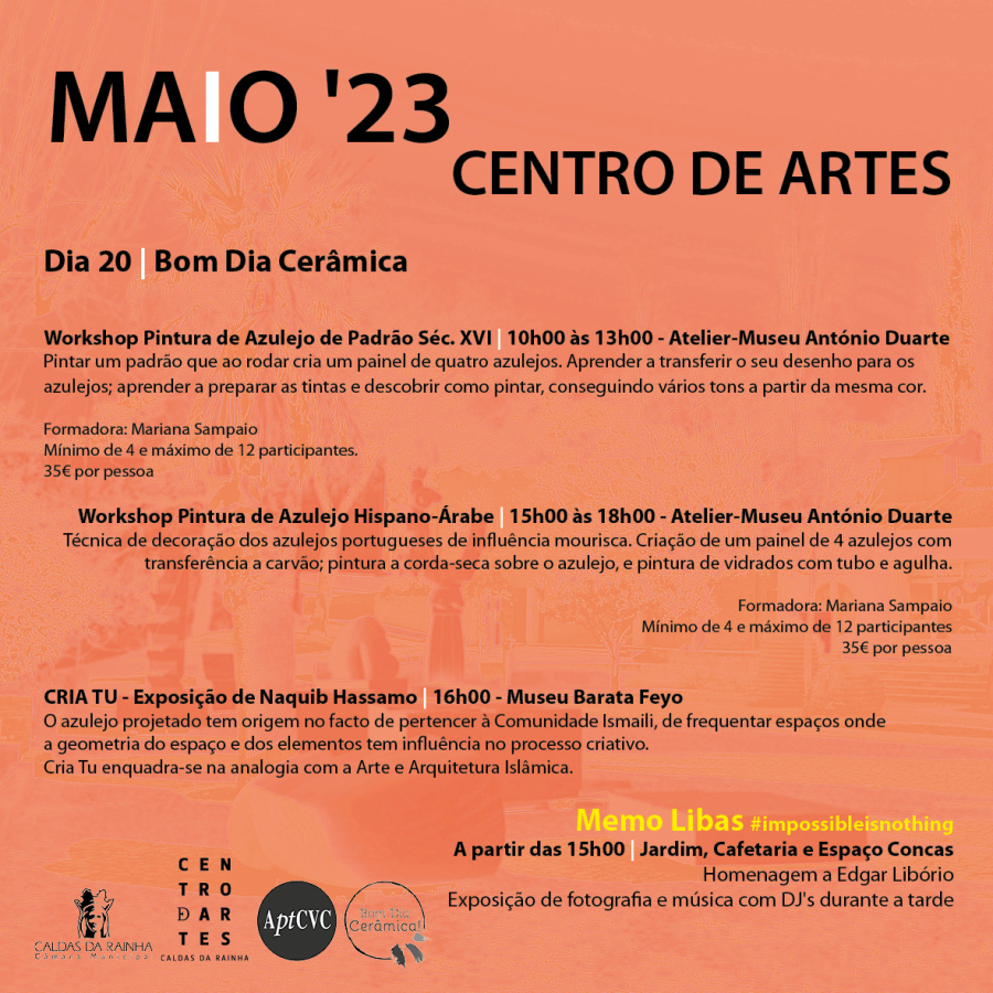Nas Caldas da Rainha, a iniciativa europeia é assinalada com um workshop de pintura de azulejo padrão do século XVI, no sábado, entre as 10 e as 13 horas, no Atelier-Museu António Duarte. Segue-se um workshop de pintura de azulejo hispano-árabe, com a aplicação de técnicas de decoração dos azulejos portugueses de influência mourisca, entre as 15 e as 18 horas, no mesmo local.