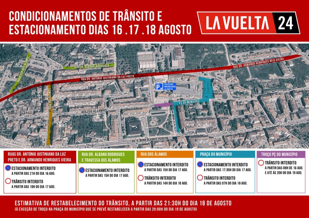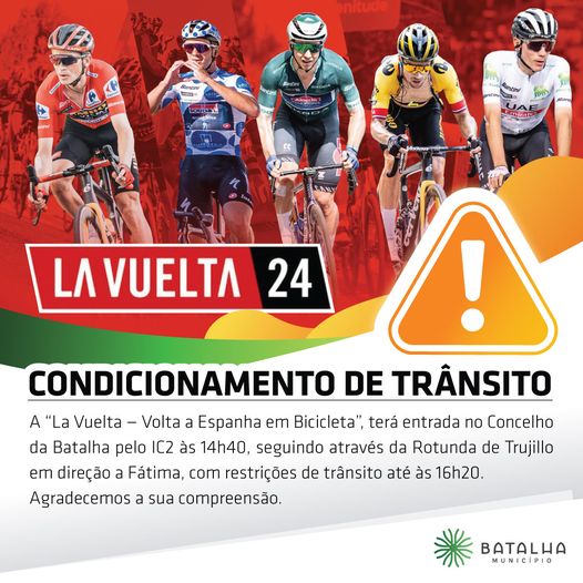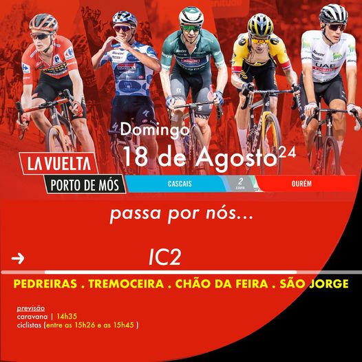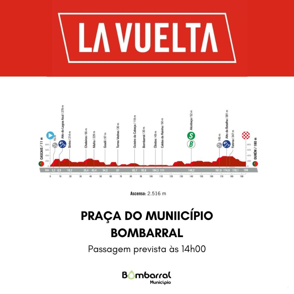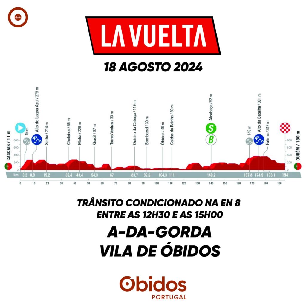 Em Caldas da Rainha, “La Vuelta 2024” passa, entre as 13h30 e as 15h15, na EN8, seguindo pelas ruas General Amílcar Mota e Vitorino Fróis, avenidas Adelino Mamede de Oliveira, do Viaduto e Eng. Marcelo Morgado, rua Professor Abílio Moniz Barreto, avenida Dr. Artur Figueiroa Rego e rua da Estrada do Lavradio.