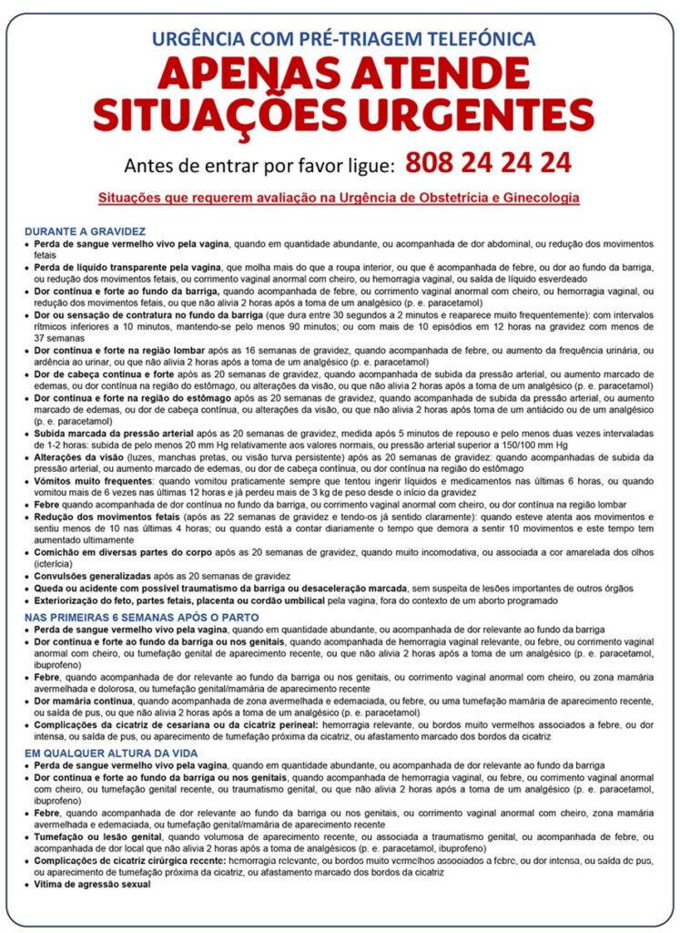 A portaria determina ainda a afixação, à entrada do SUGO, de cartazes com a mensagem “Urgência com pré-triagem telefónica – Apenas atende situações urgentes [com respetivo detalhe] – Antes de entrar por favor ligue: 808 24 24 24”, a colocação de um telefone, e a formação a seguranças e administrativos para aconselhamento às utentes, entre outros pontos.