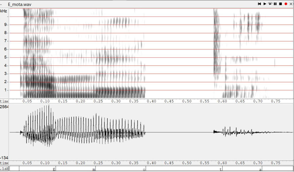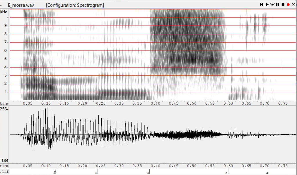 Observando os detalhes da forma de onda durante a produção de “É mó”, vemos que são diferentes porque o trato vocal assumiu configurações diferentes para articular esses três sons. Essas configurações resultam em ressonâncias diferentes, o que se vê no espectrograma acima da forma de onda. A escala de frequência do espectrograma mostra, em cada momento quais são as frequências de ressonância do trato vocal. As linhas horizontais têm um espaçamento de 1000 Hz e a intensidade das diferentes frequências num determinado momento é indicada pelo cinzento do espectrograma.