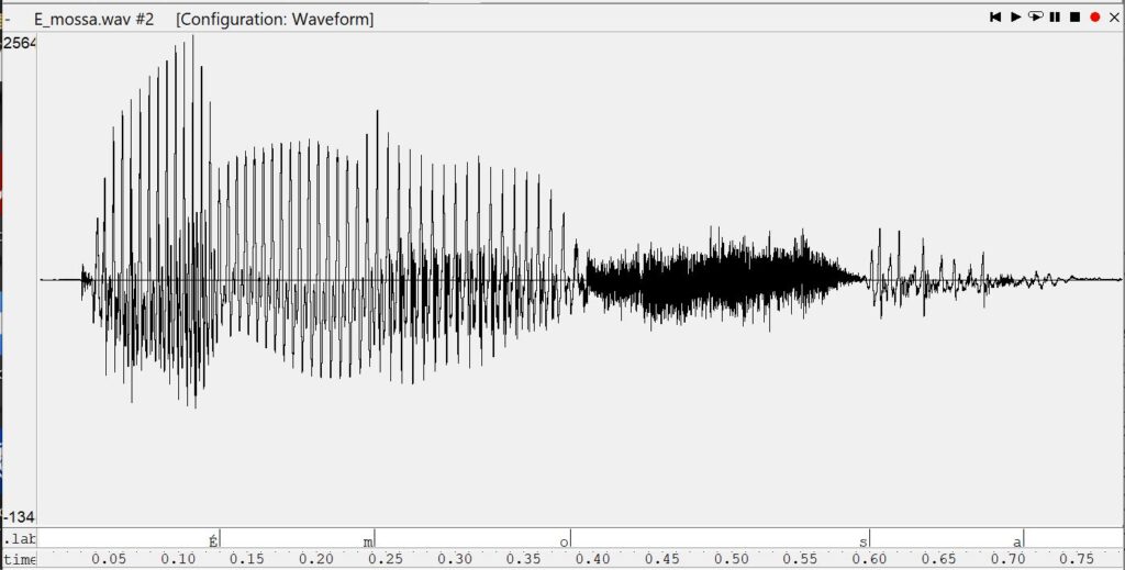 A forma de onda de “É mossa” [ɛˈmɔsɐ] muda de aspeto ao longo do tempo. Durante a maior parte do tempo, a forma de onda é regular, periódica. A periodicidade que se vê na forma de onda vem dos sons da fala que se produzem com vibração das cordas vocais. Neste caso todos os sons envolvem vibração das cordas vocais, excepto o [s] de “mossa” que mostra uma forma de onda irregular, característica de ruídos.