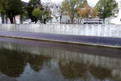 A cor roxa que "pinta" parcialmente os muros do rio Lis, no centro da cidade de Leiria, na zona do parque do Avião, tem intrigado os passantes.