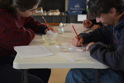 Os jovens estão a realizar tarefas relacionadas com o inventário, fotografia e estudo da coleção de vidros arqueológicos.