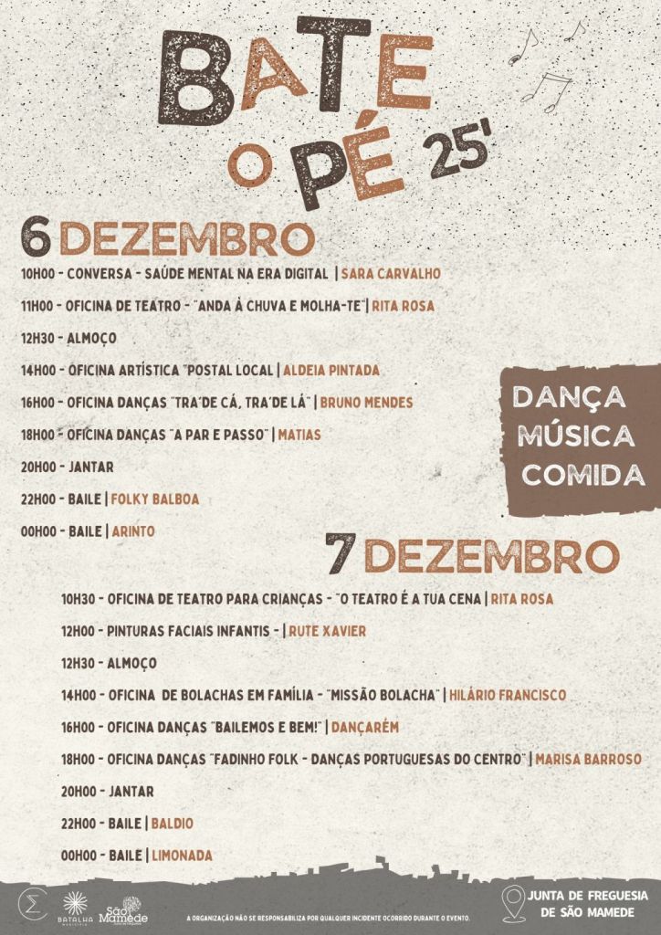 Oficinas de teatro, conversas sobre saúde mental, atividades para famílias e muita, muita música e dança folk. O festival Bate o Pé põe São Mamede, no concelho da Batalha, a mexer este fim de semana, 6 e 7 de dezembro, com dois dias repletos de workshops e bailes dedicados às novas danças portuguesas e europeias.