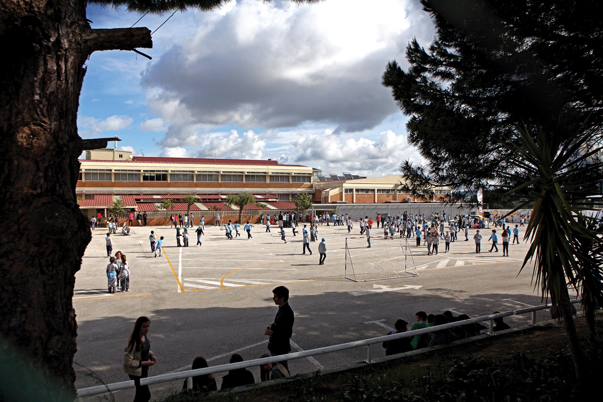 Os espaços comuns são geridos em horário diferente para cada valência, e o recreio é um exemplo. Os alunos do Pré-Escolar nunca se encontram com os do 1º Ciclo em simultâneo. Temos dois espaços de recreio, cada um com 450 m2 aproximadamente. Os alunos do pré-escolar, entre as 10.30 e as 11, dividem-se pelos dois espaços (os três anos de um lado, os de quatro e cinco anos do outro. No dia seguinte trocam). Após o almoço, como os alunos de três anos dormem, ficam os de quatro num recreio e os de cinco noutro. Quer isto dizer que os alunos estão num máximo de setenta e cinco em cada um dos espaços.