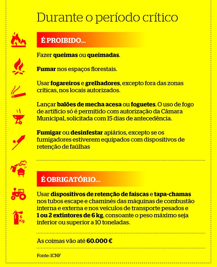 Entretanto, a Autoridade Nacional de Proteção Civil já alertou para o risco de incêndios nos próximos dias, apelando para um cuidado redobrado. Lembra ainda a listagem de atividades que permanecem proibidas, atendendo às condições meteorológicas e do terreno. Assim, recorda que não é permitido realizar queimadas ou fogueiras; utilizar equipamentos de queima e de combustão; queimar matos cortados e amontoados ou qualquer tipo de sobrantes de exploração; lançar balões com mecha acesa ou qualquer outro tipo de foguetes; fumar ou fazer lume de qualquer tipo nos espaços florestais ou vias circundantes; proceder à fumigação ou desinfestação de apiários com equipamentos sem dispositivos de retenção de faúlhas.