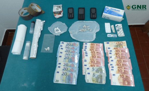 As duas buscas realizadas, uma domiciliária e outra ao automóvel, resultaram ainda na apreensão de “63 doses de heroína; 50 doses de cocaína; 410 euros em numerário; três telemóveis; um automóvel e produto de corte (20 comprimidos/uma caixa redrate)”, revelou a GNR em comunicado.