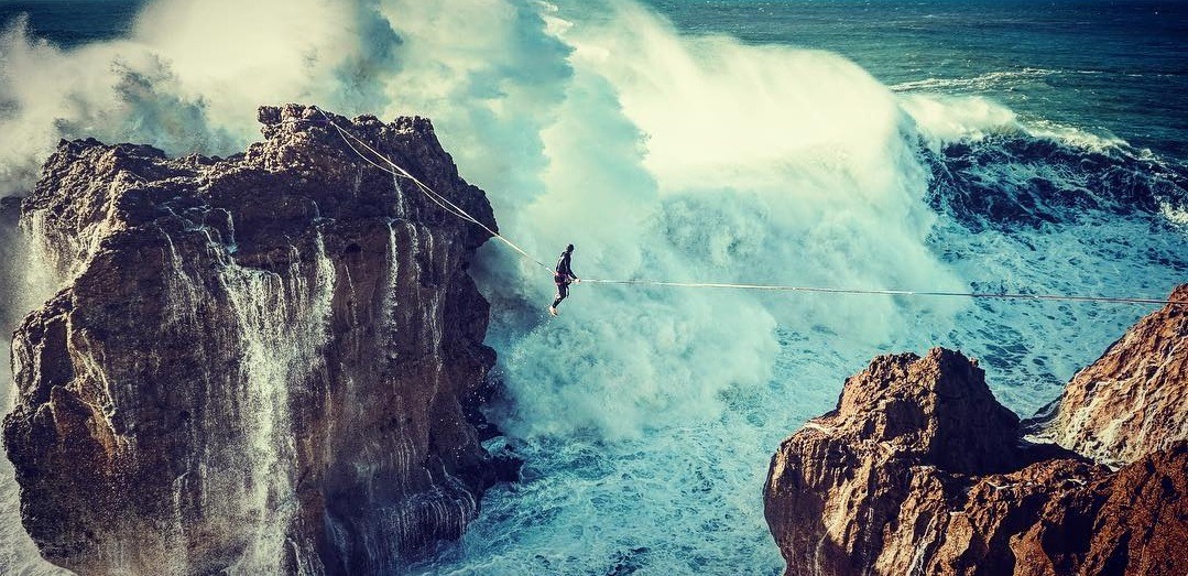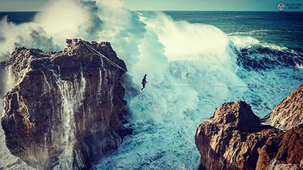 Se surfar as ondas gigantes da Nazaré é uma missão só para os Bond do surf, imagine andar 25 metros em cima de uma corda, com as ondas a rebentar lá em baixo.