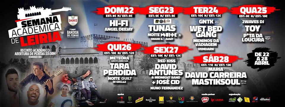A Semana Académica de Leiria 2018 arranca domingo, dia 22 de abril, decorrendo com programação diária até 28 de abril.