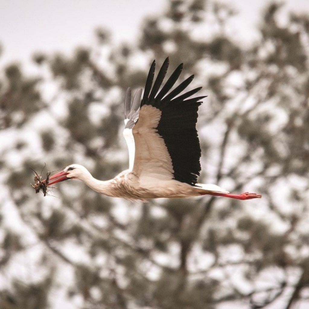 Cegonha branca (Ciconia ciconia) Tem pescoço e patas compridas, tonalidade branca do corpo, com as pontas das primárias e secundárias pretas. Cor vermelha viva no bico e patas.