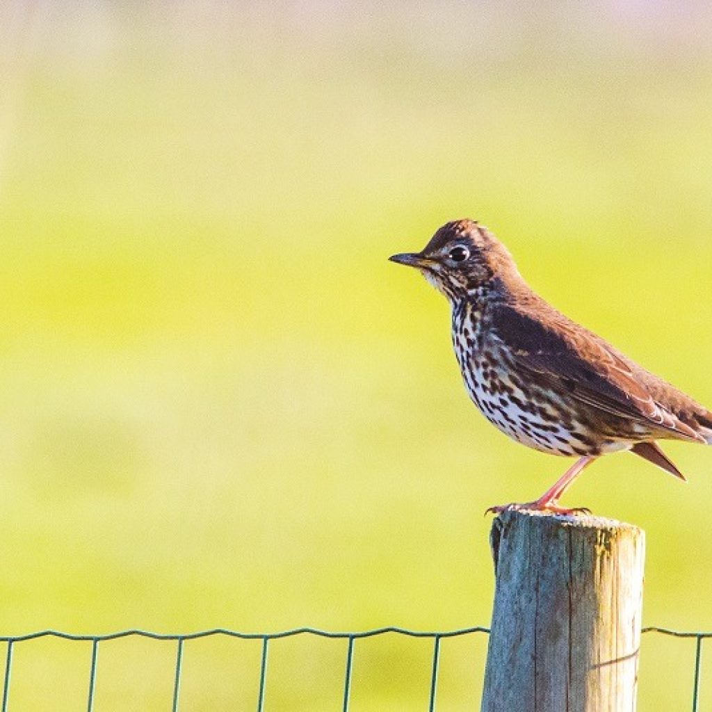 Tordo-comum (Turdus philomelos). Mais pequeno que o melro-preto, tem plumagem castanha. As partes inferiores são brancas, sarapintadas de castanho