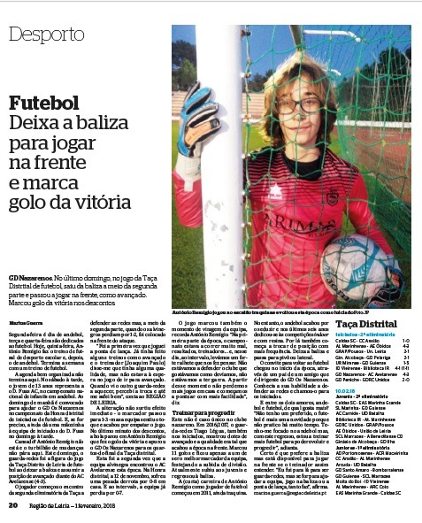 Marina Guerra, jornalista e editora do Desporto do REGIÃO DE LEIRIA, venceu o Prémio Desporto com Ética para Imprensa Regional, com a reportagem “Deixa a baliza para jogar na frente e marca golo da vitória”, publicada na edição de 1 de fevereiro de 2018 (Leia o artigo aqui)