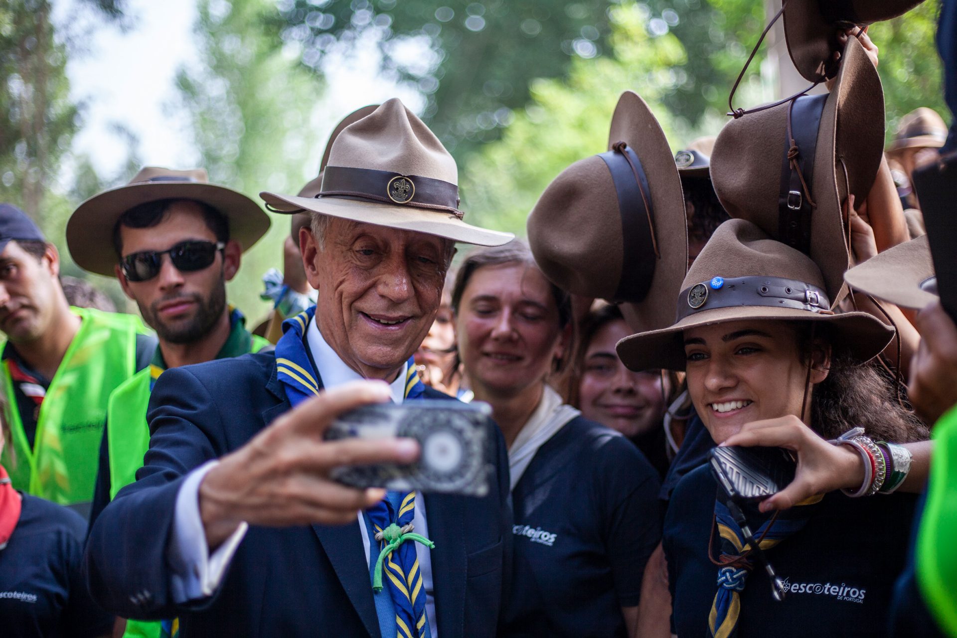 Levou uma hora para percorrer cerca de 200 metros. Apesar das temperaturas a rondar os 40 graus, ontem à tarde, em Barosa, Leiria, o Presidente da República não acelerou o passo e distribuiu, como é seu apanágio, centenas de autógrafos, abraços e beijos, e tirou outras tantas selfies assim que passou o pórtico do Acampamento Nacional da Associação de Escoteiros de Portugal (AEP).
