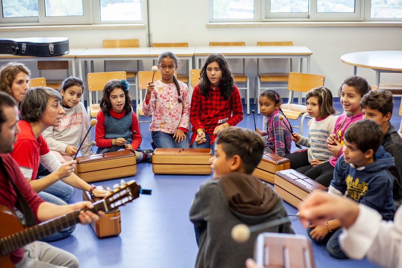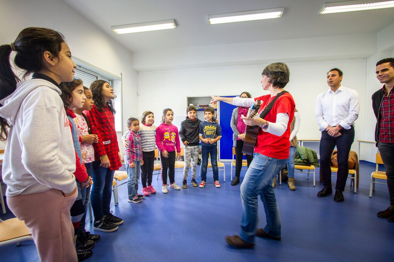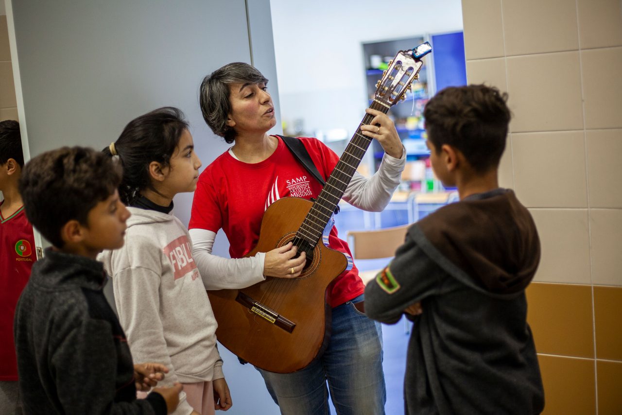 Todas as quintas-feiras, os alunos da comunidade cigana que frequentam a escola do 1º ciclo Dr. Correia Mateus, em Leiria, deixam a sala de aulas para participar numa sessão musical dinamizada pela SAMP – Sociedade Artística Musical dos Pousos. Levam com eles um amigo (não cigano) com quem partilham cantigas tradicionais do mundo, da cultura portuguesa e cigana, mas também erudita.