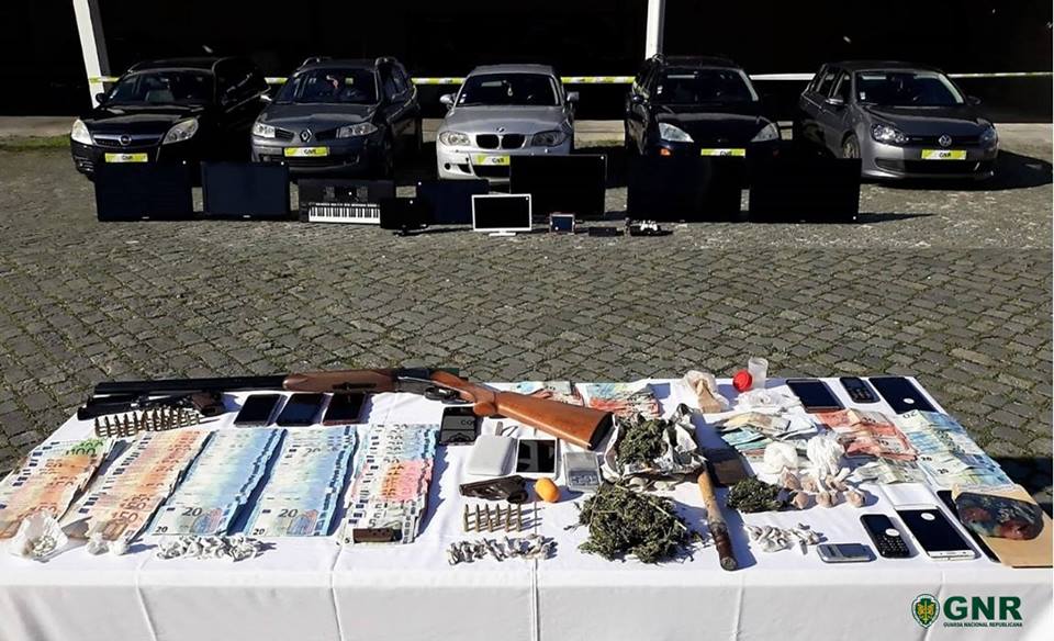 As 12 buscas domiciliárias e não domiciliárias realizadas levaram ainda à apreensão de três armas de fogo e 61 munições, seis veículos, 12 telemóveis, nove artigos em ouro, oito televisores, dois tablets e duas consolas, duas balanças de precisão, uma câmara de filmar e 10.686 euros em numerário.