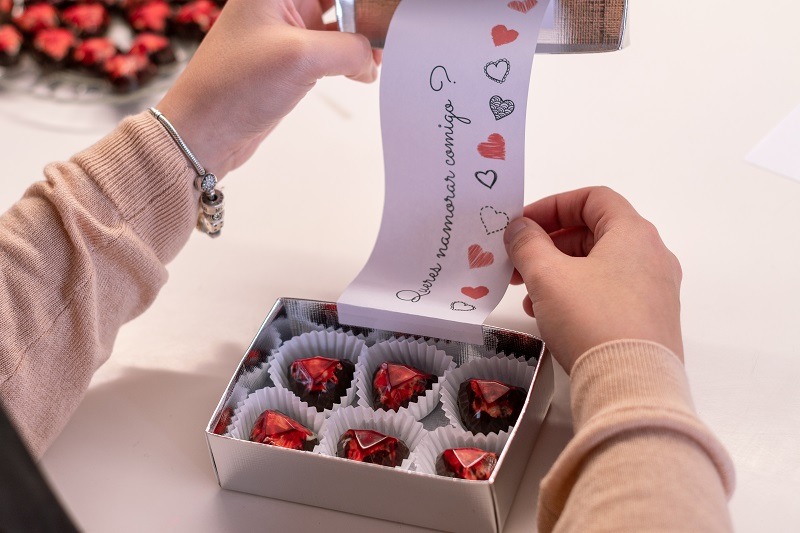 Fundada há exatamente um ano, em Leiria, a marca de chocolates feitos à mão combina com amor desde o princípio. É que as primeiras confeções de Joana Marinho tinham mesmo o intuito de chegar como prenda aos enamorados. Este ano o projeto amadureceu e a data não só ganhou recheio especial – ganache de avelã – como tem três apresentações para escolha. Numa das caixas de São Valentim os bombons belgas vêm em formato de diamantes, pintados à mão, ao lado de 10 vales criativos a serem personalizados. Noutra caixa, são oferecidos em cubinhos de chocolates com declarações de afeto por escrito. Saem a partir de 13,95€ e podem ser encomendadas até dia 11.