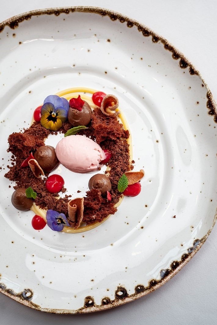 Formado pelo curso técnico de cozinha do Instituto Politécnico de Leiria, Rúben deve ao restaurante a afinidade que desenvolveu. “Gosto de ser exigente comigo mesmo e acho que a partir disso consigo criar experiências diferentes”, comenta o profissional que hoje divide as horas de folga entre pesquisar, testar e criar sobremesas do tipo charuto de chocolate recheado com creme de chocolate, praliné de avelã e caramelo salgado. “Aqui podemos dar asas à nossa imaginação”, sublinha convincente.