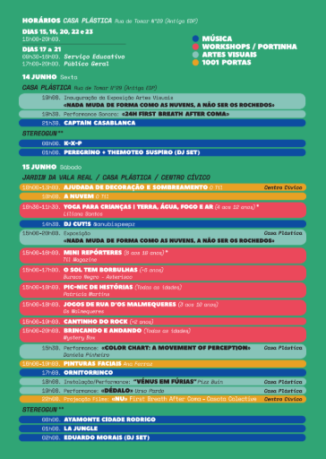 O programa é variado e para todos os gostos. A abertura do festival é esta sexta-feira, 14 de junho, na Casa Plástica (antigo edficío da EDP Leiria), a partir das 19 horas. Até dia 23 há muito para viver n’A Porta, que vai ter a muitos concertos, atividades para famílias, jantares temáticos e Feira Bandida. A ação desenrola-se entre a Casa Plástica, Rua Direita, Villa Portela, Stereogun, Jardim da Vala Real, Parque do Avião, Centro Cívico, Jardim Luís de Camões, Fonte Luminosa, Atlas Hostel, Livraria Arquivo, casas particulares e Teatro José Lúcio da Silva. O programa integral pode ser consultado no site oficial e também em PDF.