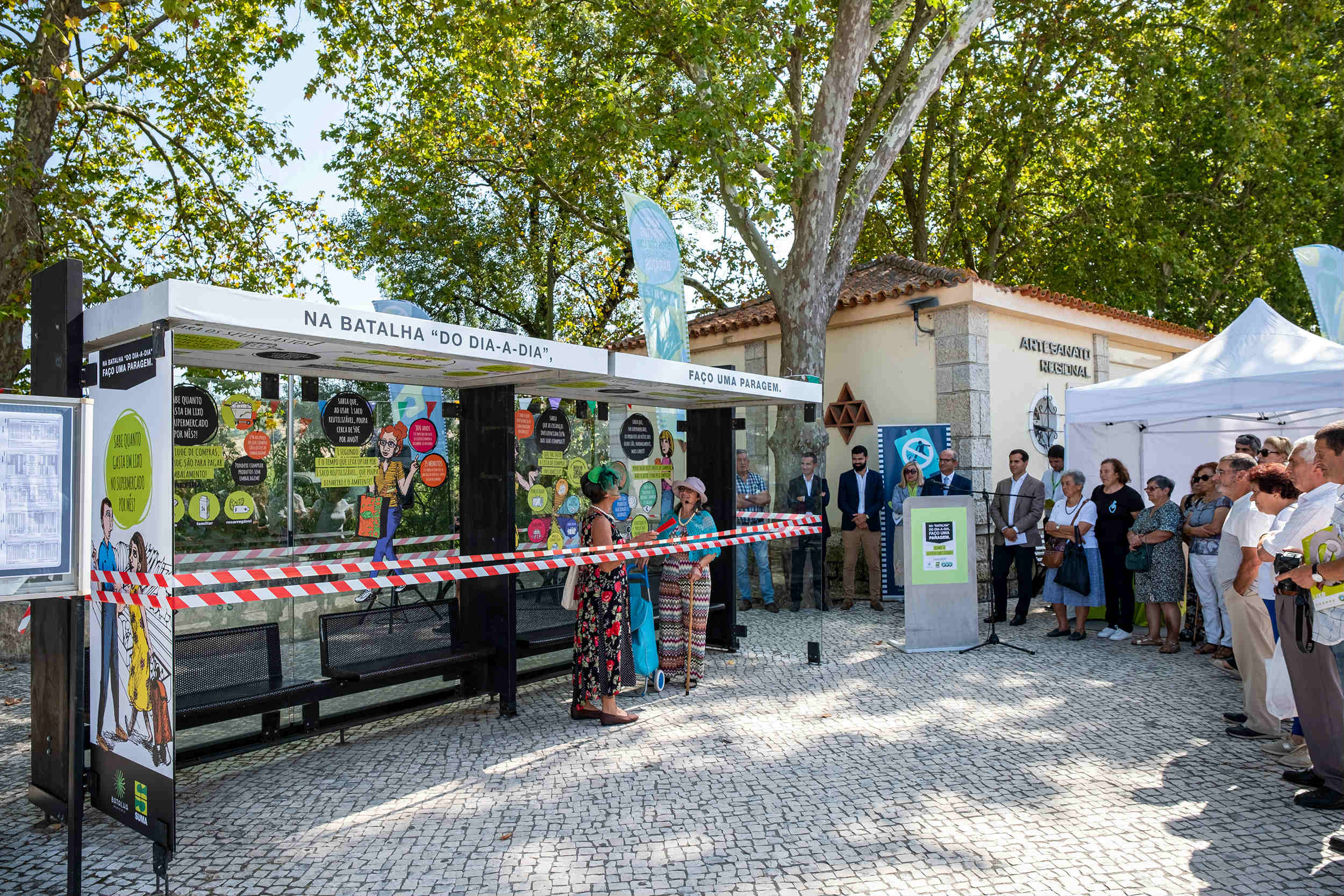 Foi no Largo 14 de agosto, na vila da Batalha, na manhã de terça-feira, dia 17, que o projeto foi inaugurado, junto à paragem de autocarros que lá está instalada. A paragem está agora “decorada” com diversas mensagens ambientais. “Sabia que ao usar um saco reutilizável, poupa cerca de 50 euros por ano?”, é o exemplo de uma das mensagens com que os utilizadores de transportes coletivos são confrontados na paragem de autocarro. Objetivo? Mudar comportamentos.