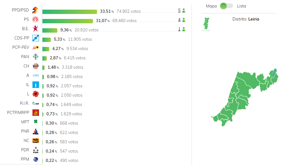O PSD vence no distrito de Leiria com 33,51% dos votos, mantendo cinco deputados. Já o PS conseguiu eleger quatro deputados, mais um do que em 2015, tendo conquistado 31,07% dos votos. O BE garante um deputado e o CDS-PP perde o que tinha eleito em 2015 em coligação com o PSD.