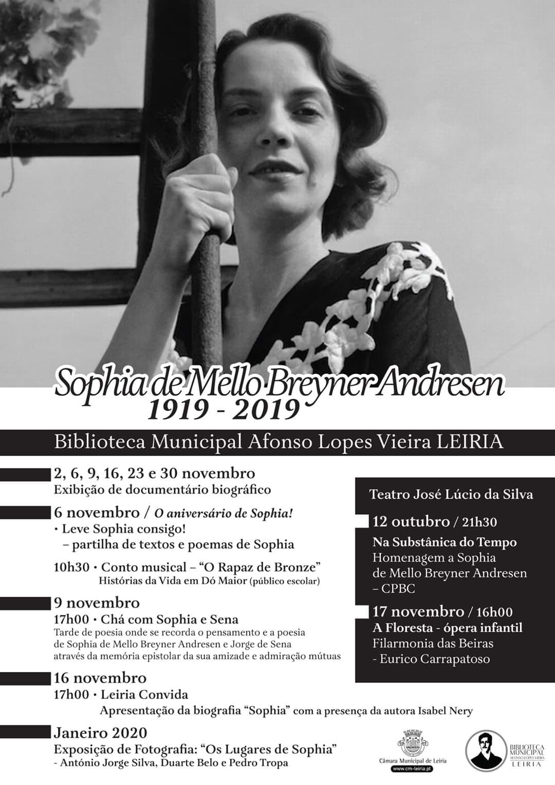 A escritora e jornalista Isabel Nery apresenta a primeira biografia de Sophia de Mello Breyner Andresen em mais uma sessão de “Leiria Convida” na Biblioteca Municipal Afonso Lopes Vieira, sábado, dia 16 de novembro. “Sophia” conta a história da primeira portuguesa a receber o Prémio Camões – e a única a receber honras de Panteão Nacional – e resulta de uma intensa investigação da autora. Isabel Nery entrevistou mais de 60 pessoas para recolher material para a biografia, do pescador José Muchacho ao ensaísta Eduardo Lourenço, entre muitos outros amigos e protagonistas do mundo das letras e da política. A sessão está incluída no programa de comemoração do centenário de Sophia de Mello Breyner em Leiria, uma programação que decorre durante o mês de novembro. O programa inclui, no domingo, 17 de novembro, a apresentação da ópera infantil “A Floresta”, de Eurico Carrapatoso, inspirada num conto de Sophia de Mello Breyner. É no Teatro José Lúcio da Silva, pela Orquestra Filarmonia das Beiras.