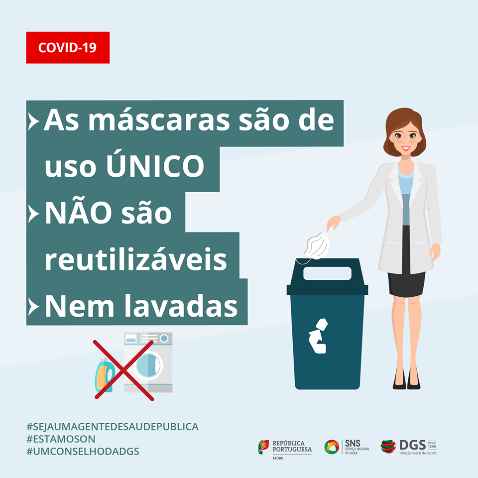 As características técnicas das máscaras utilizadas mais frequentemente – as máscaras cirúrgicas – recomendam que estas sejam de utilização única. A sua utilização repetida poderá representar um risco de contágio, pois podem ficar contaminadas após a primeira utilização. Da mesma forma, estas máscaras não foram concebidas para serem lavadas/desinfetadas, pelo que não se pode garantir a sua segurança nestas circunstâncias.